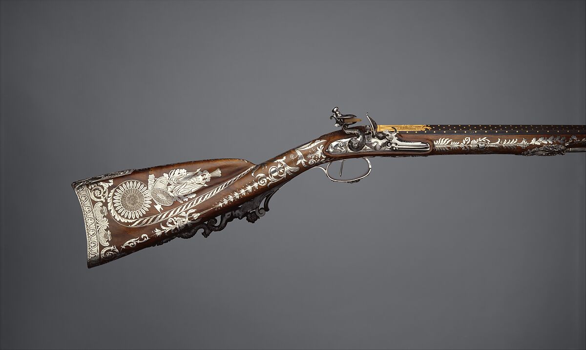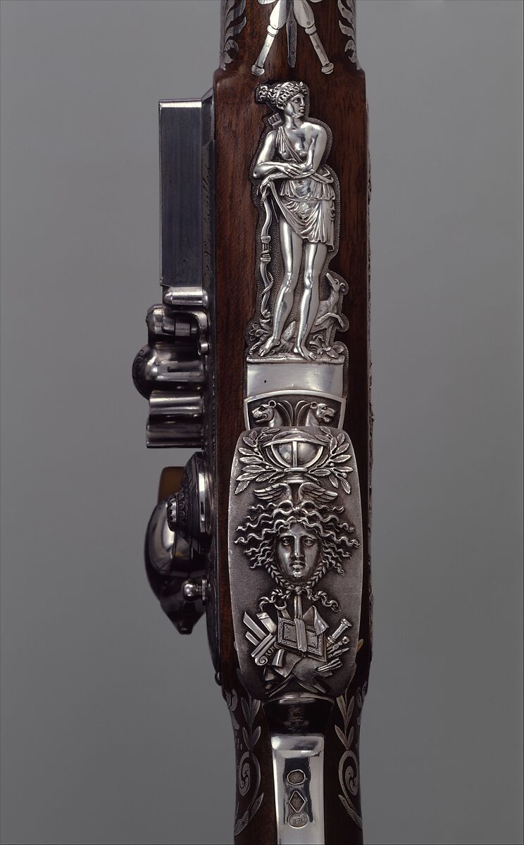 Gunstocks were inlaid with engraved sheet silver and gold, and the mounts were often of heavy silver cast in bold relief. The decoration included trophies of arms and scenes of classical battles and victories that implied France’s military glory.