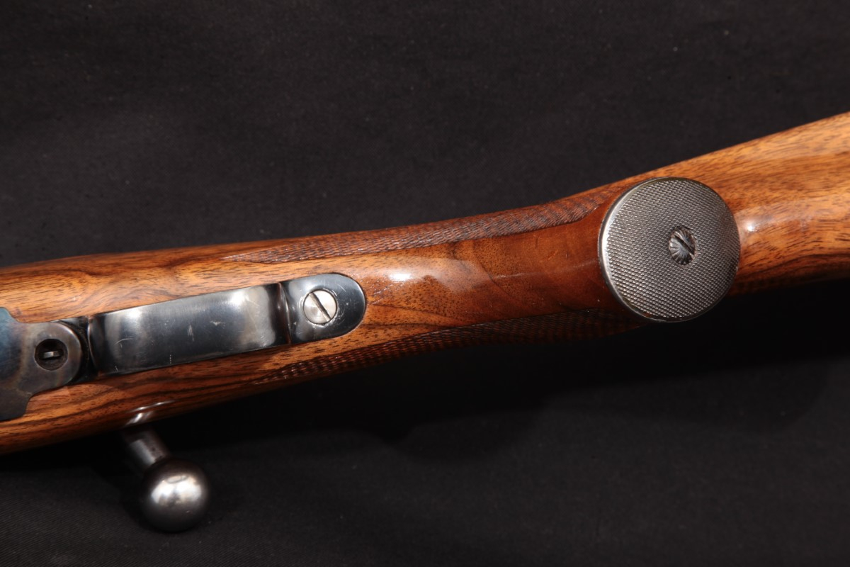 The wing safety on the bolt was changed to a thumb button on the bolt to accommodate scope mounting. EAW quick detachable scope rings and bases were installed on a hand made rear cantilever.