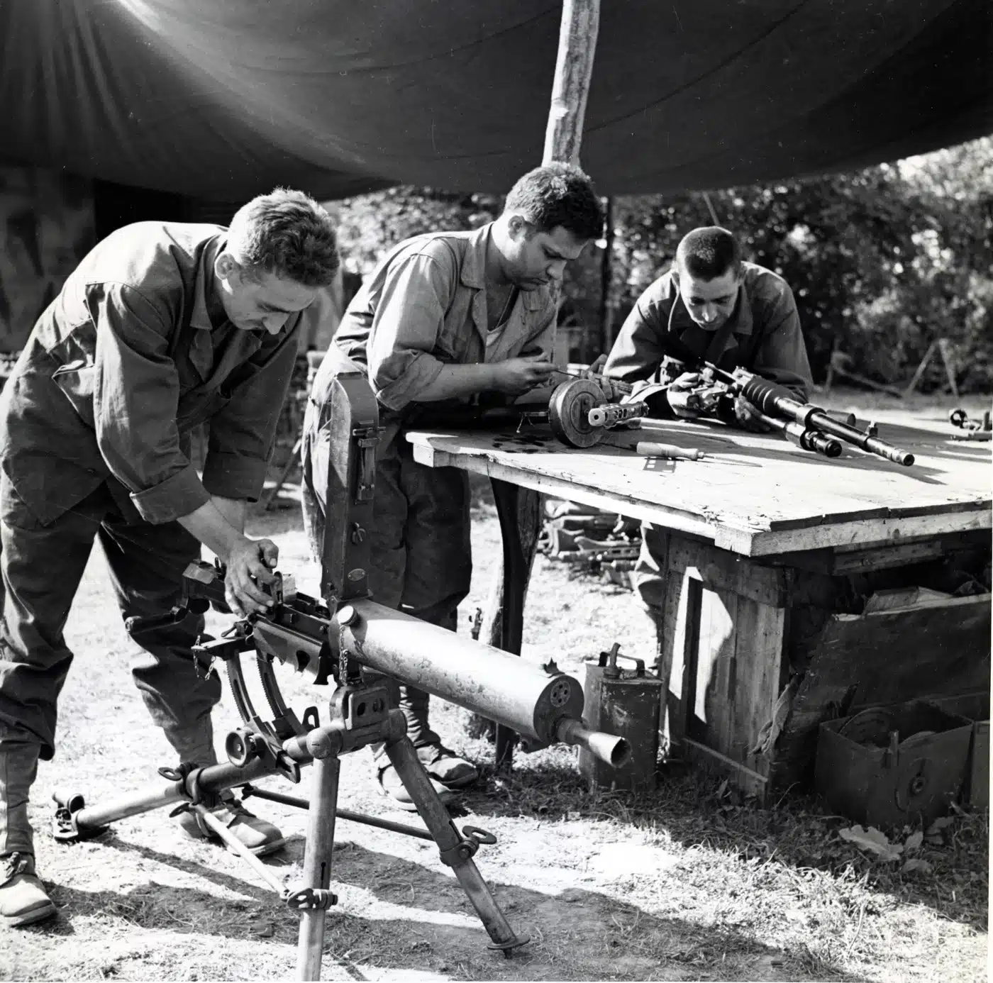 American soldiers test a German-modified Renault UE Chenillette armored carrier vehicle captured in France. A MG15 has been added to provide firepower for the airfield security vehicle. Image: NARA