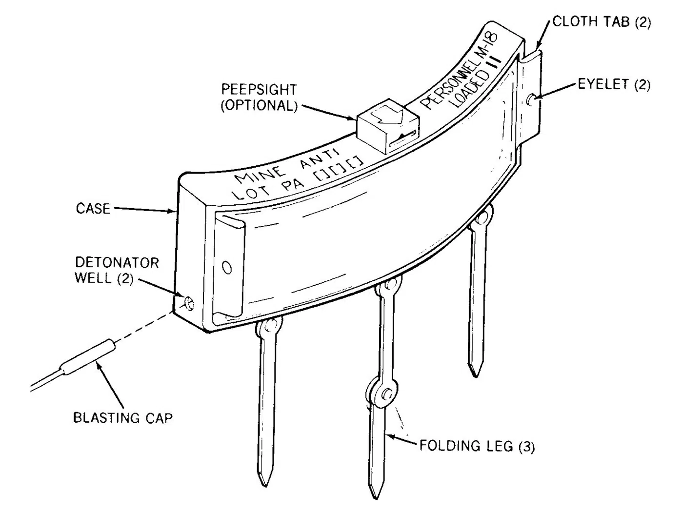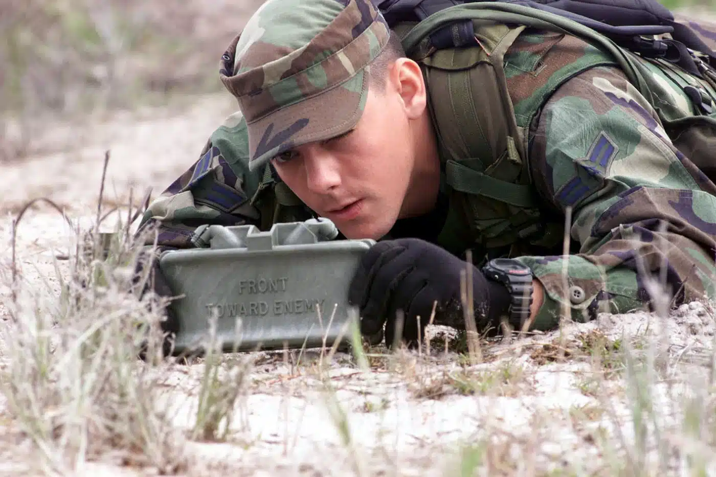 A claymore mine is typically command-detonated via wire crimped to an M4 electrical blasting cap. The detonation is initiated by an M57 squeeze-type firing device (often called a “clacker” for the snapping sound it makes when squeezed to fire the mine), which sends an impulse to the blasting cap and detonates the Claymore.