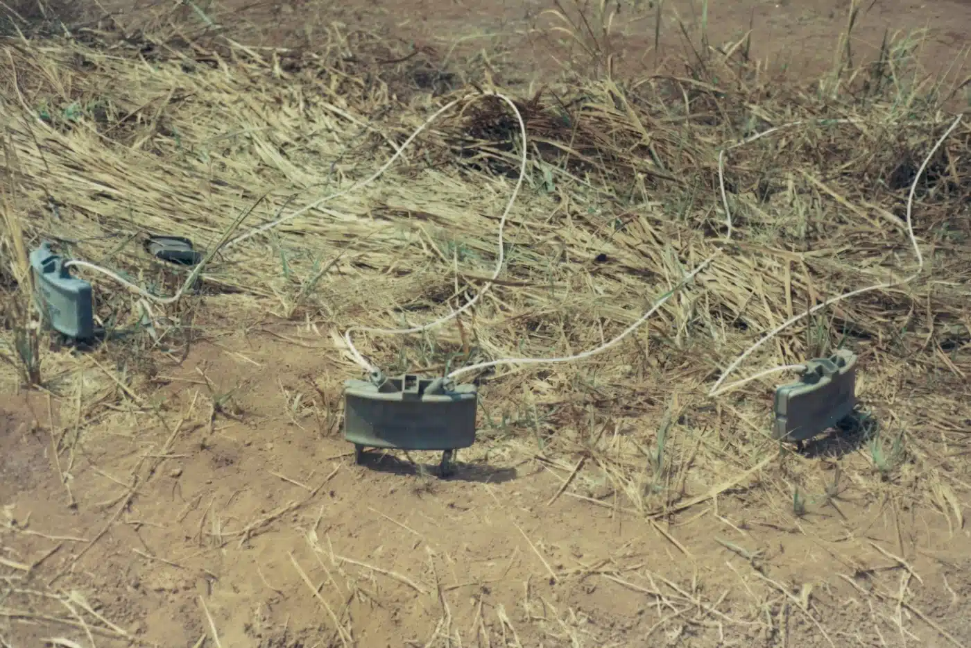 Then, pull the shipping plug from one of the two “ears” on top of the device and thread in the blasting cap. Screw the shipping plug back in to prevent the wired cap from dislodging and camouflage the emplacement with local flora. Then unspool the wire as you return to the firing position.