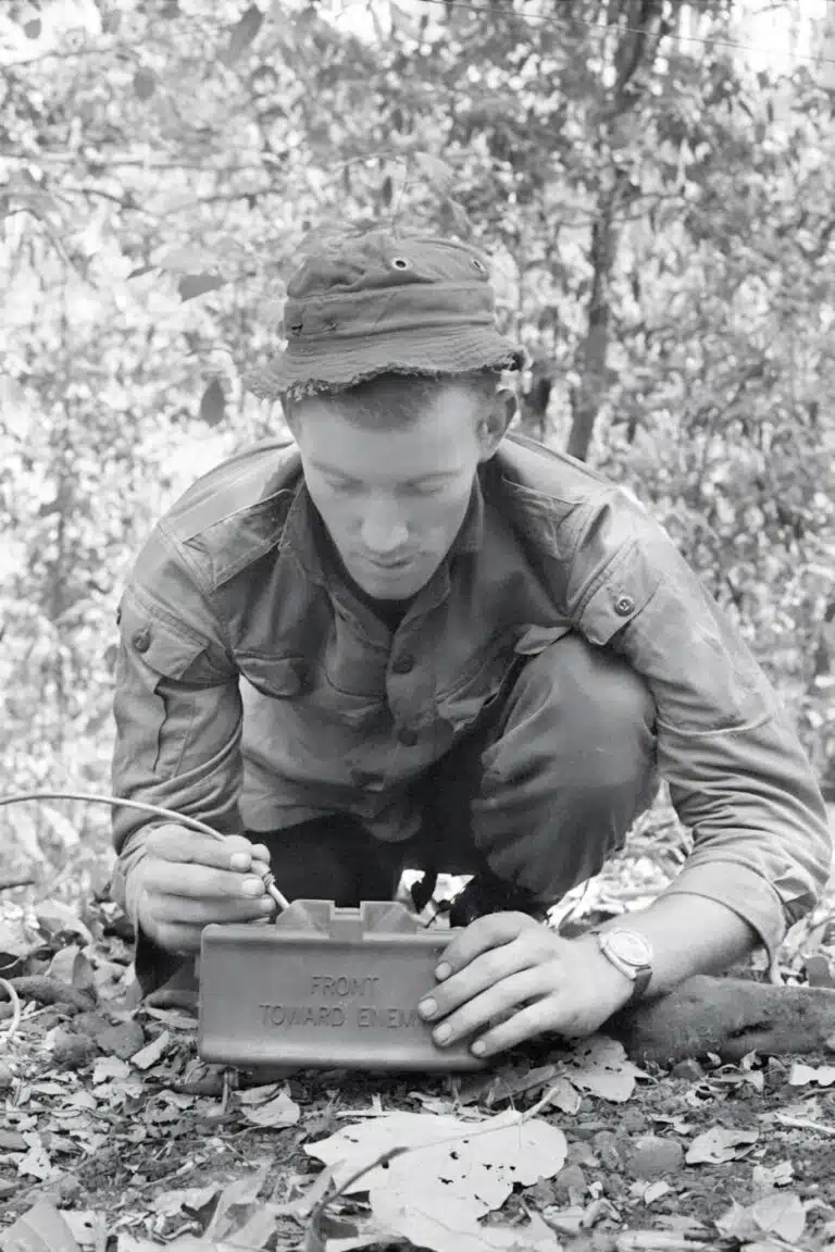 In simple terms, to set the Claymore a soldier or Marine selected a firing position that would give him some protection from backblast, about 20 meters to the rear of the mine itself, and preferably in a hole or behind solid frag cover.
