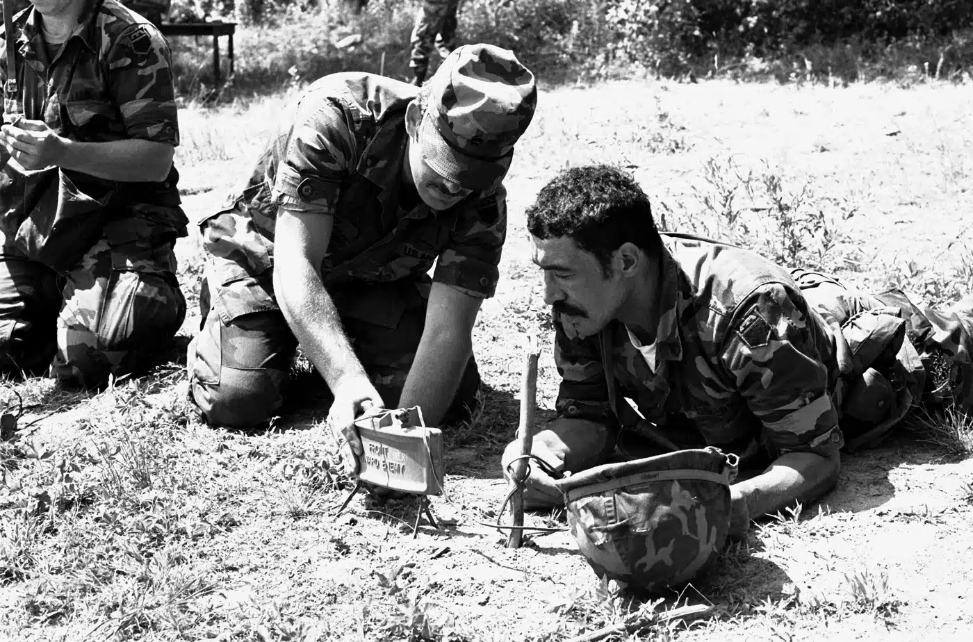 Members of Company A, 15th Engineer Battalion, check the damage caused by a Claymore mine on standing targets within a 50-meter distance of the explosion. Image: SSgt. Sandi Pellicano/NARA