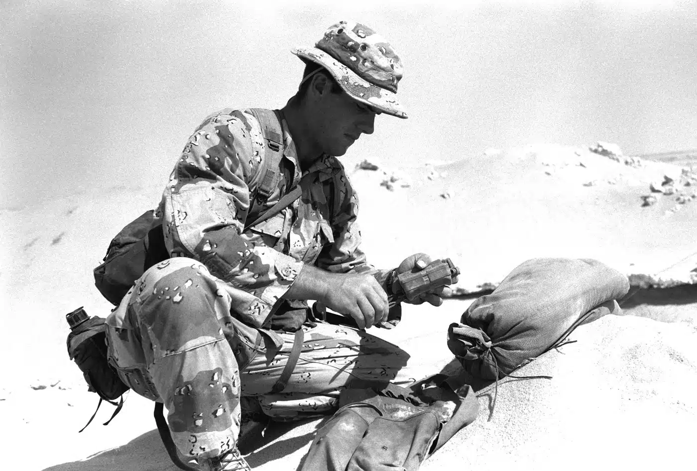 LCpl. M. Spann sets up an M18A1 Claymore mine at the entrance to the combat operations center for the 1st Battalion, 7th Marines during Operation Desert Shield. Image: Cpl. D. Haynes/U.S.M.C.