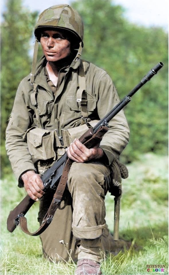 He was killed less than two weeks after this picture was taken, on July 12,1944. At the time of this photo, he had received credit for killing 27 enemy snipers with his (BAR) Browning Automatic Rifle.